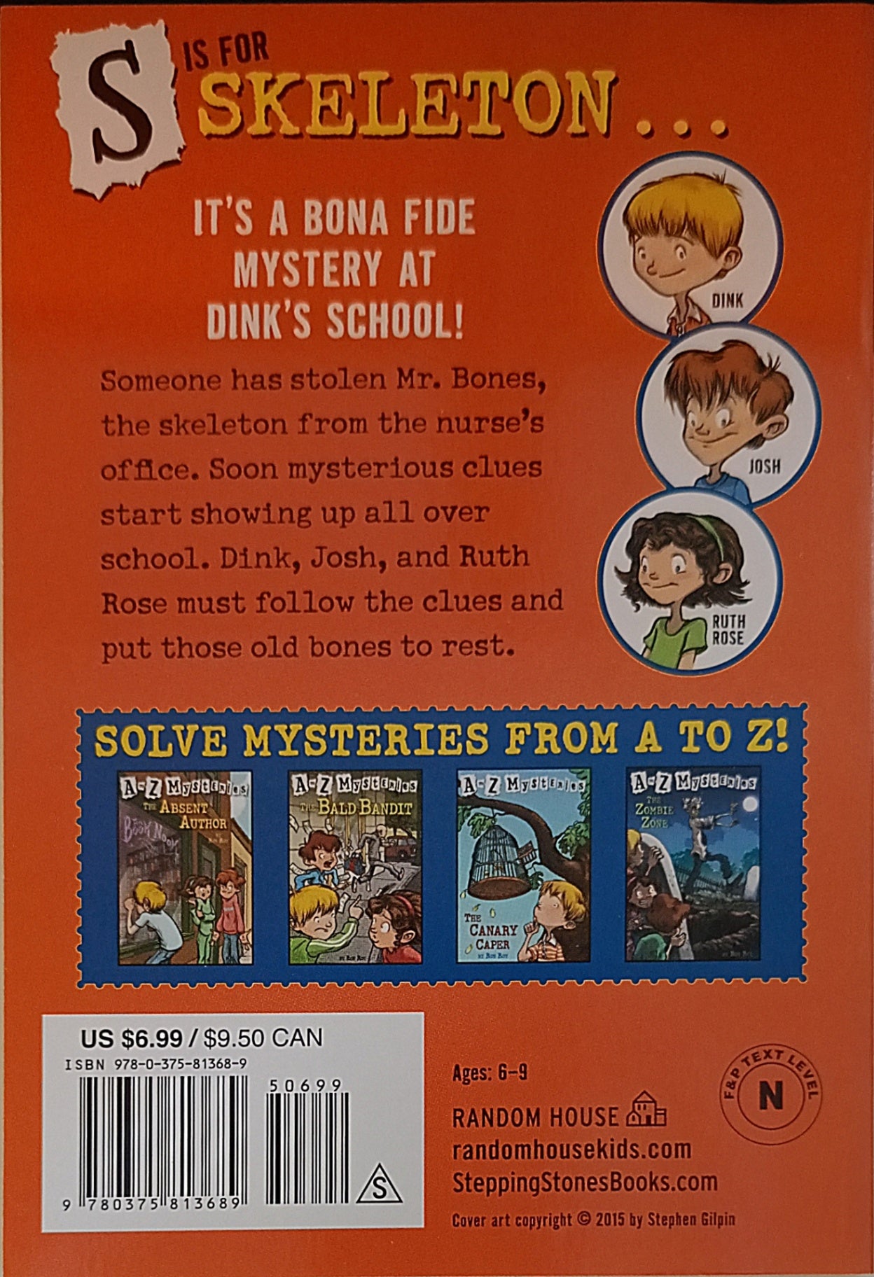 S is for Skeleton . . . Itâs a bona fide mystery at Dinkâs school! Someone has stolen Mr. Bones, the skeleton from the nurseâs office. Soon mysterious clues start showing up all over the school. Dink, Josh, and Ruth Rose must follow the clues and put those old bones to rest.