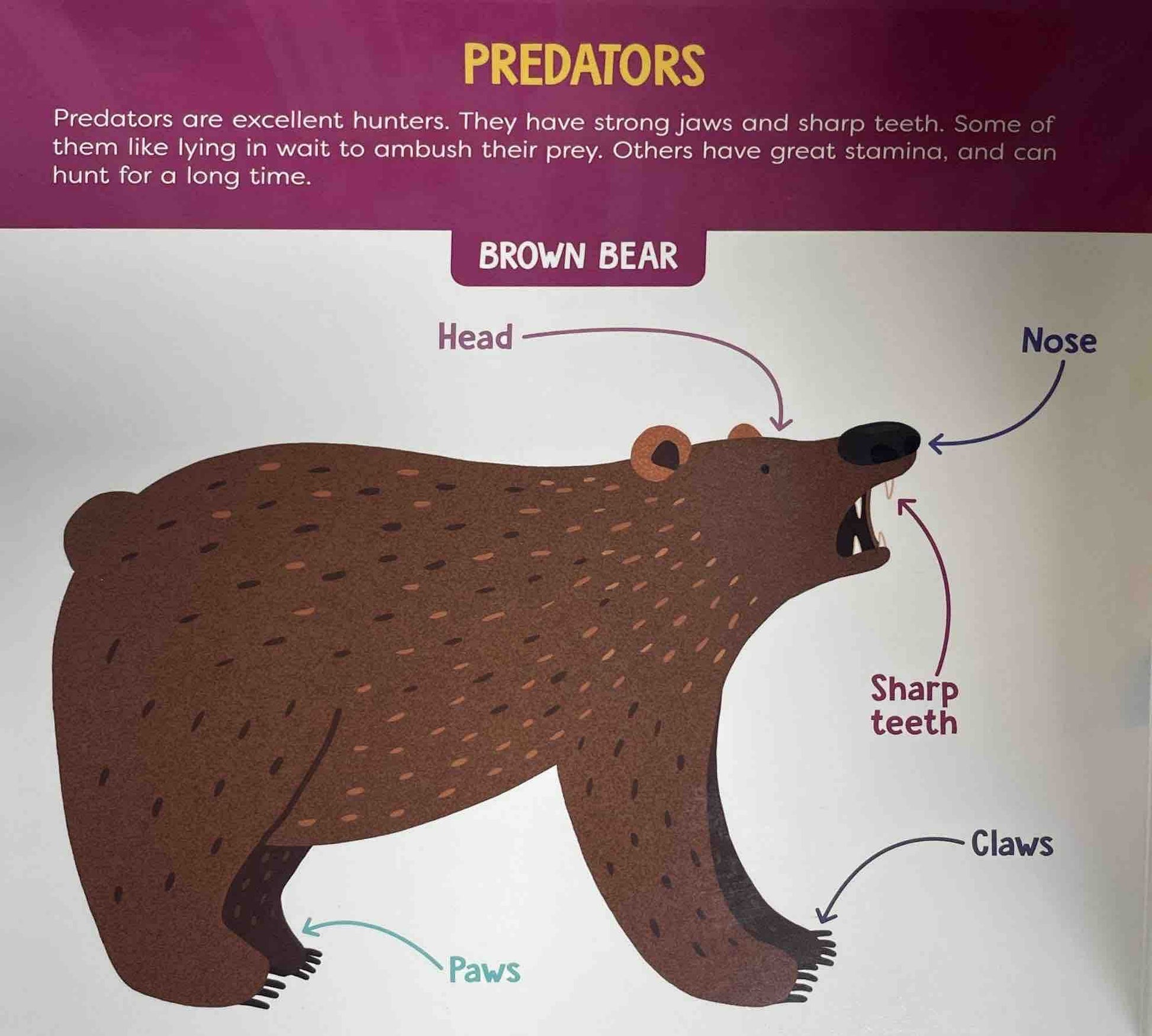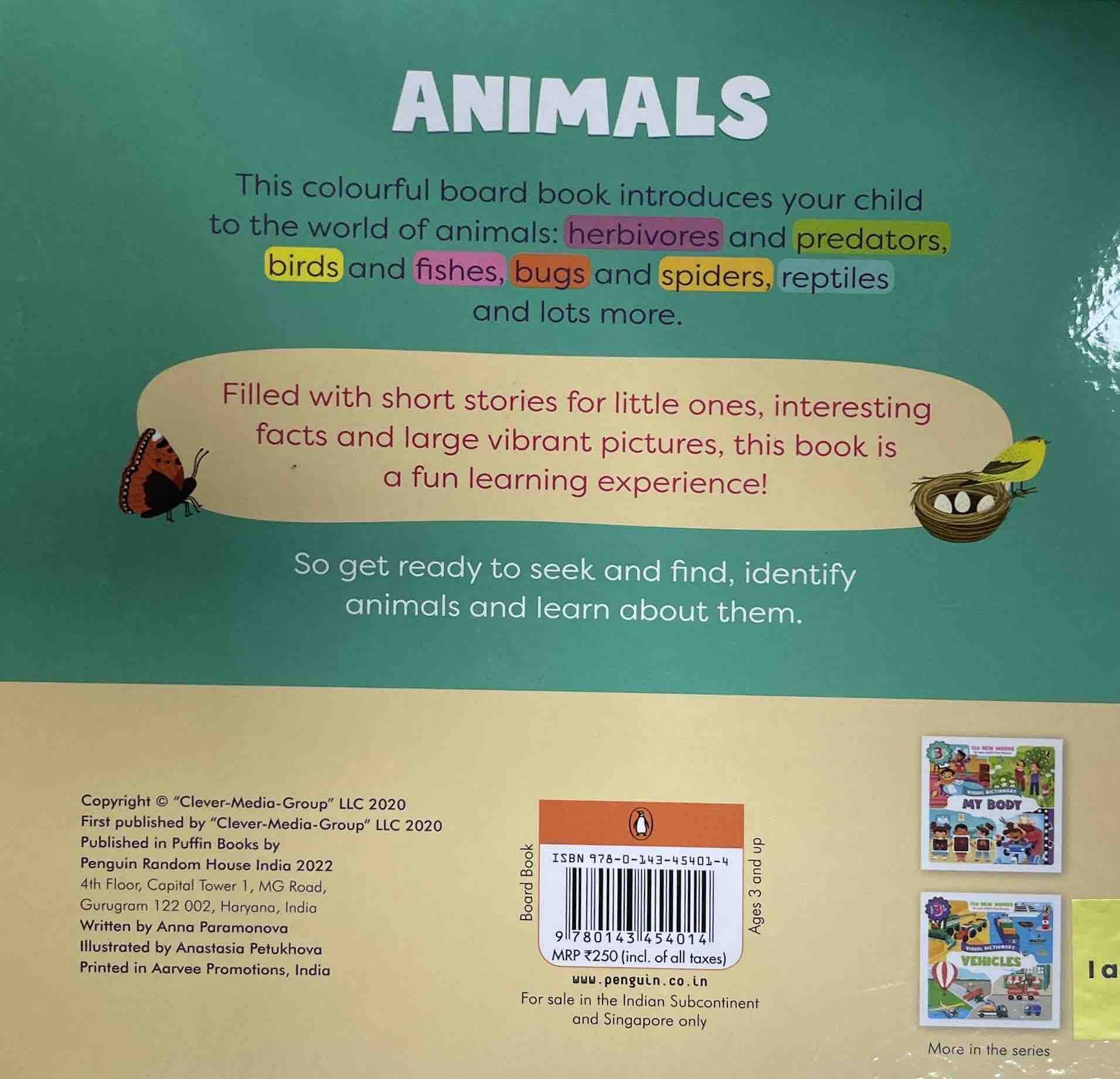 This colourful board book introduces your child to the world of animals: herbivores and predators, birds and fishes, bugs and spiders, reptiles and lots more. Filled with short stories for little ones, interesting facts and large vibrant pictures, this book is a fun learning experience! So get ready to seek and find, identify animals and learn about them. KEY FEATURES: LARGE FORMAT Big pages give little readers lots of room to explore their very first words ACTIVE LEARNING Sprinkled with hints and seek and find activities PERFECTLY SIZED BOOKS Easy and convenient for little readers to hold BRIGHT AND BEAUTIFUL PICTURES Full of eye-catching, colourful illustrations and drawings CHILD-FRIENDLY FUN Designed with the developmental needs of 3 and up to keep them interested and engaged LEARNING OUTCOMES: Each themed book features fun-filled pictures, things to name and inviting questions and activities. Combines Seek and Find activities with new words providing hours of fun and learning. Build vocabulary through picture-word association. Curated for every preschooler's holistic learning experience as they identify animals and learn about them.