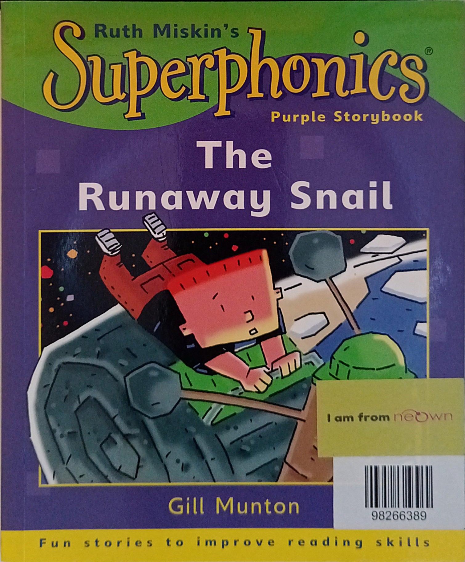 Superphonics Purple Storybook-The Runaway Snail is a part of the Superphonics series that helps children learn to read and write with phonics. In this story, a snail runs away from a garden and the children try to find him. The book includes fun activities and questions to help children develop their reading skills.