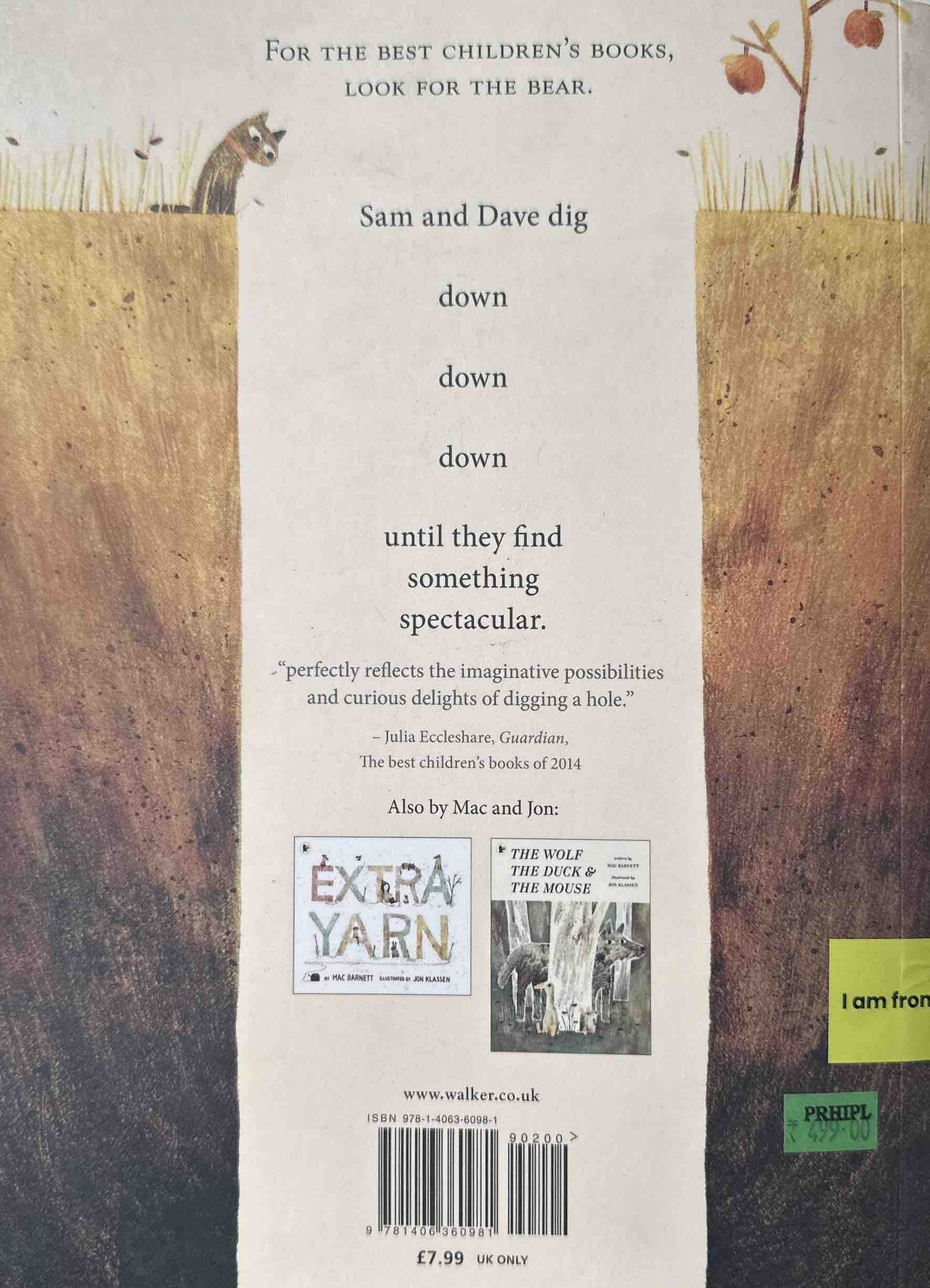 A 2015 Caldecott Honor BookWith perfect pacing, the multi-award-winning, New York Times best-selling team of Mac Barnett and Jon Klassen dig down for a deadpan tale full of visual humor. Sam and Dave are on a mission. A mission to find something spectacular. So they dig a hole. And they keep digging. And they find . . . nothing. Yet the day turns out to be pretty spectacular after all. Attentive readers will be rewarded with a rare treasure in this witty story of looking for the extraordinary — and finding it in a manner you’d never expect.