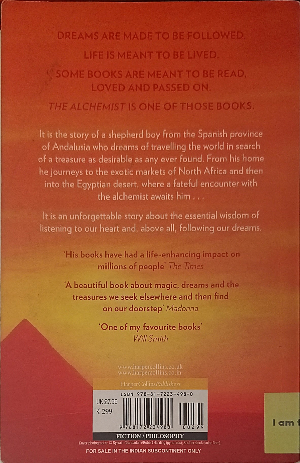 A philosophical novel that follows the journey of a shepherd boy named Santiago who dreams of finding a treasure in the Egyptian pyramids.