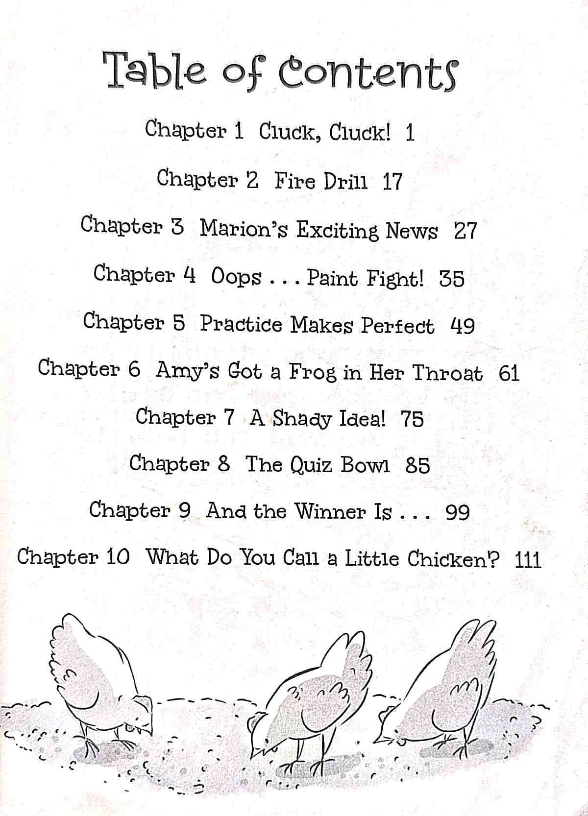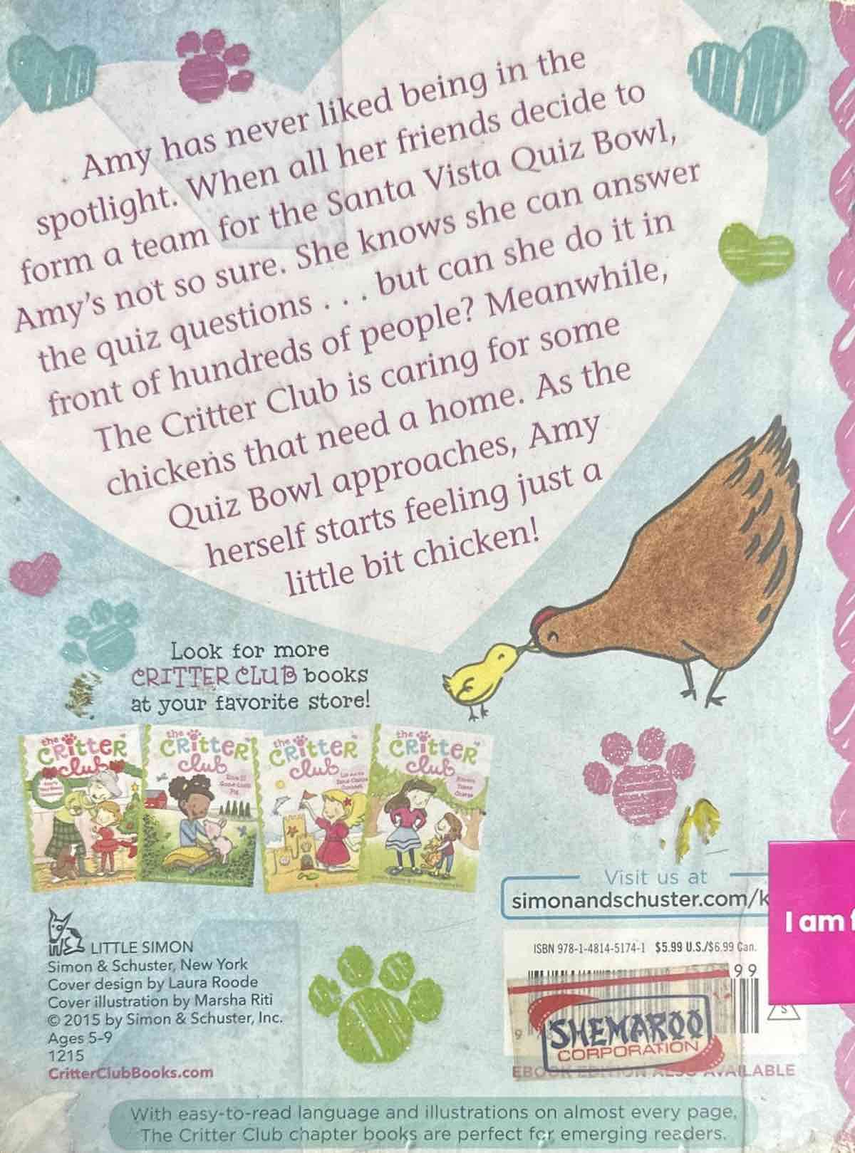 Amy has never liked being in the spotlight. When all of her friends decide to form a team for the Santa Vista Quiz Bowl, Amy isn’t so sure it’s a good idea. She knows she can answer the quiz questions…but can she do it in front of hundreds of people?Meanwhile, the Critter Club is caring for a few chickens that need a home. And as the day of the Quiz Bowl gets closer, Amy starts to feel a little bit chicken herself! Will she get over her stage fright and help her team win?