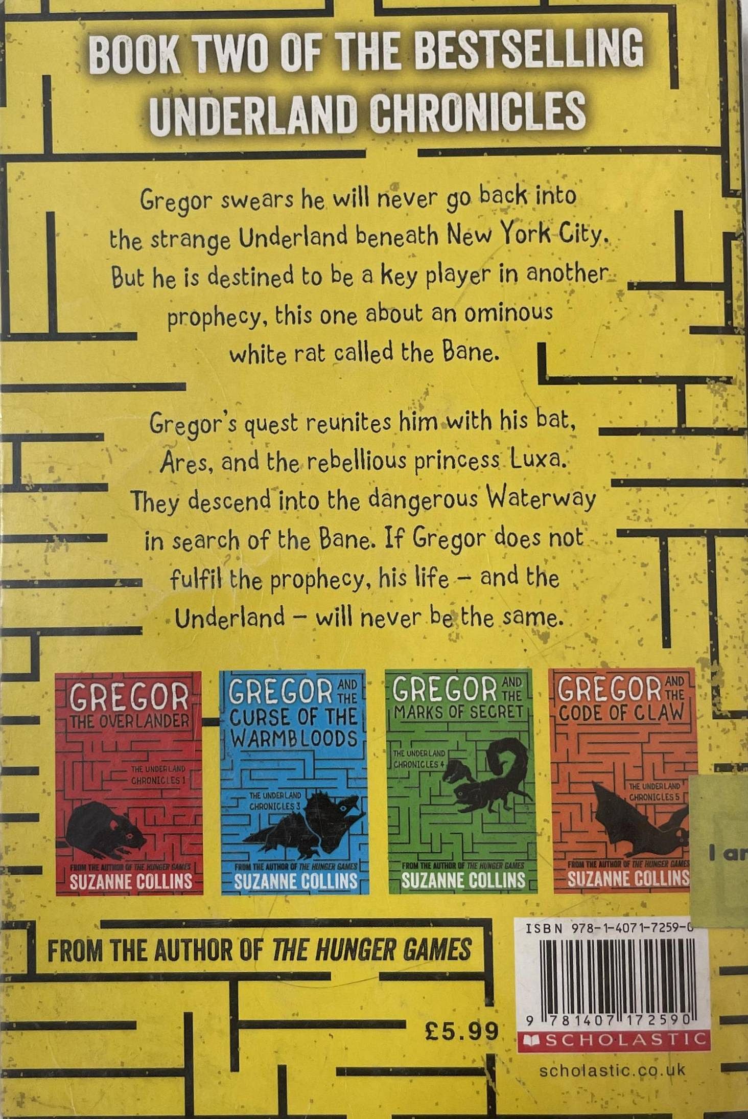 The second book in the bestselling Underland Chronicles series by the author of The Hunger Games. Gregor swears he will never return to the Underland, that strange world below New York City. But he is a key player in another prophecy, this one about an ominous white rat called the Bane. The Underlanders know there is only one way to lure Gregor back to their world: by kidnapping his little sister, Boots.