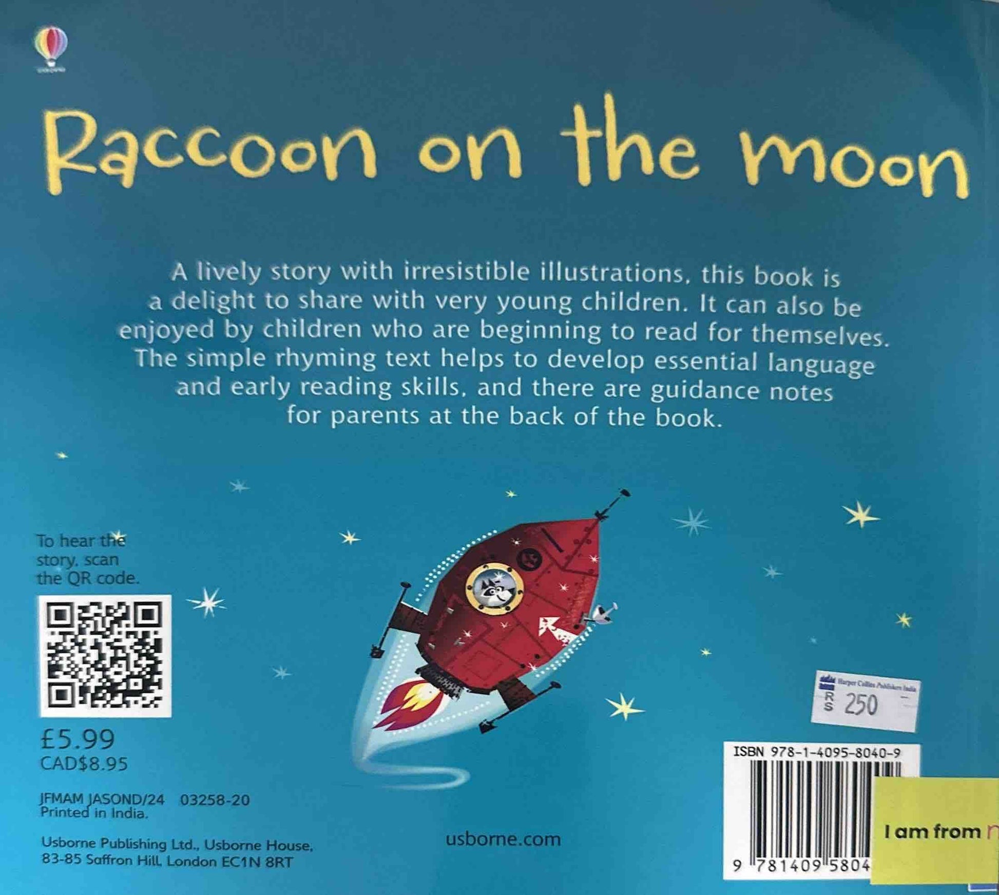 A funny rhyming story with phonic repetition and colourful illustrations specially designed to help children learn to read. “Goodbye!” cries Raccoon, “I’m off to the moon. I’ll be back by lunchtime, or late afternoon.” Goose grins and she giggles. “You foolish Raccoon!” Simple, rhyming text helps children to develop essential language and early reading skills, and there are guidance notes for parents at the back of the book.
