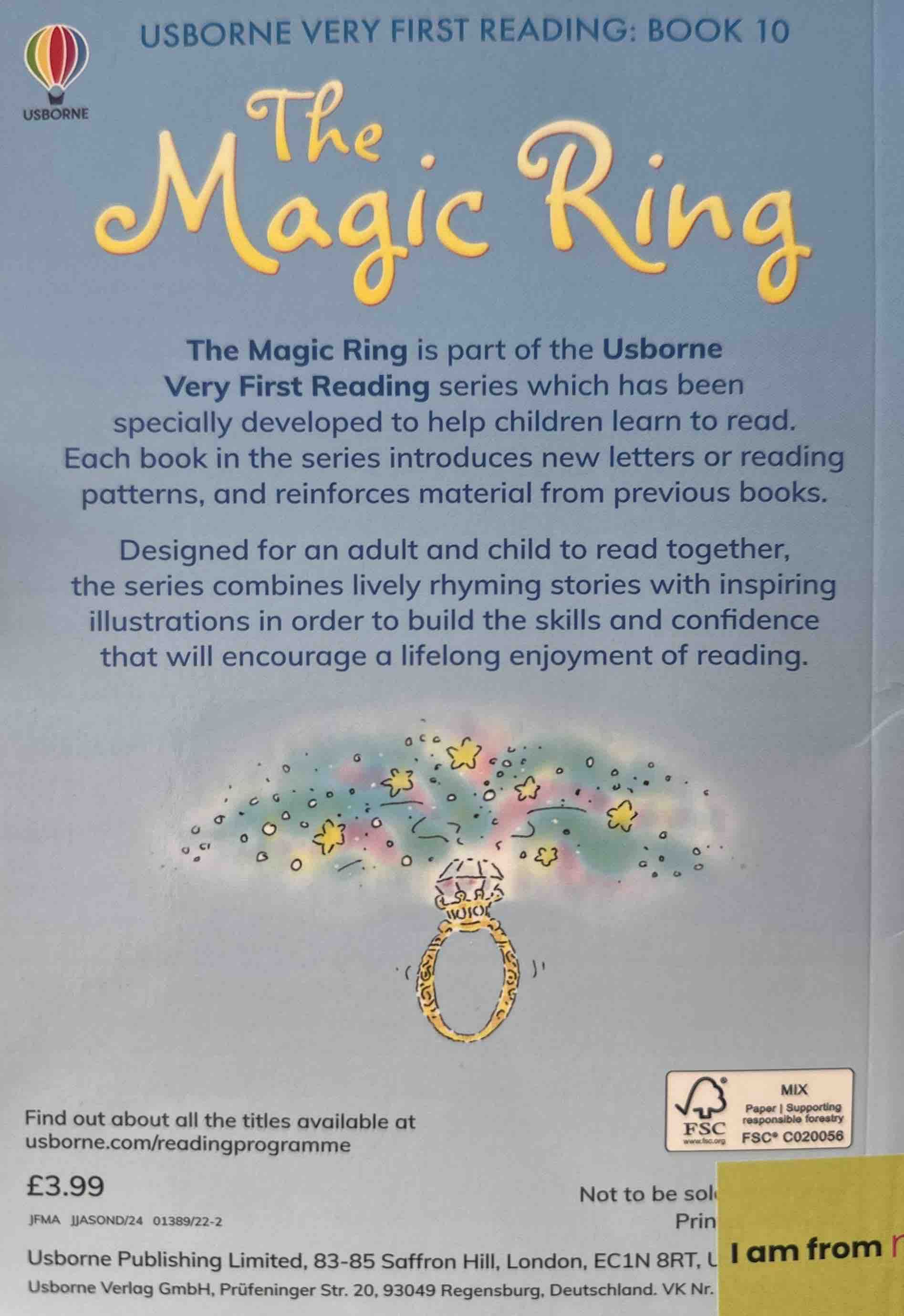 The Magic Ring is part of the Usborne Very First Reading series which has been specially developed to help children learn to read. Each book in the series introduces new letters or reading patterns, and reinforces material from previous books.