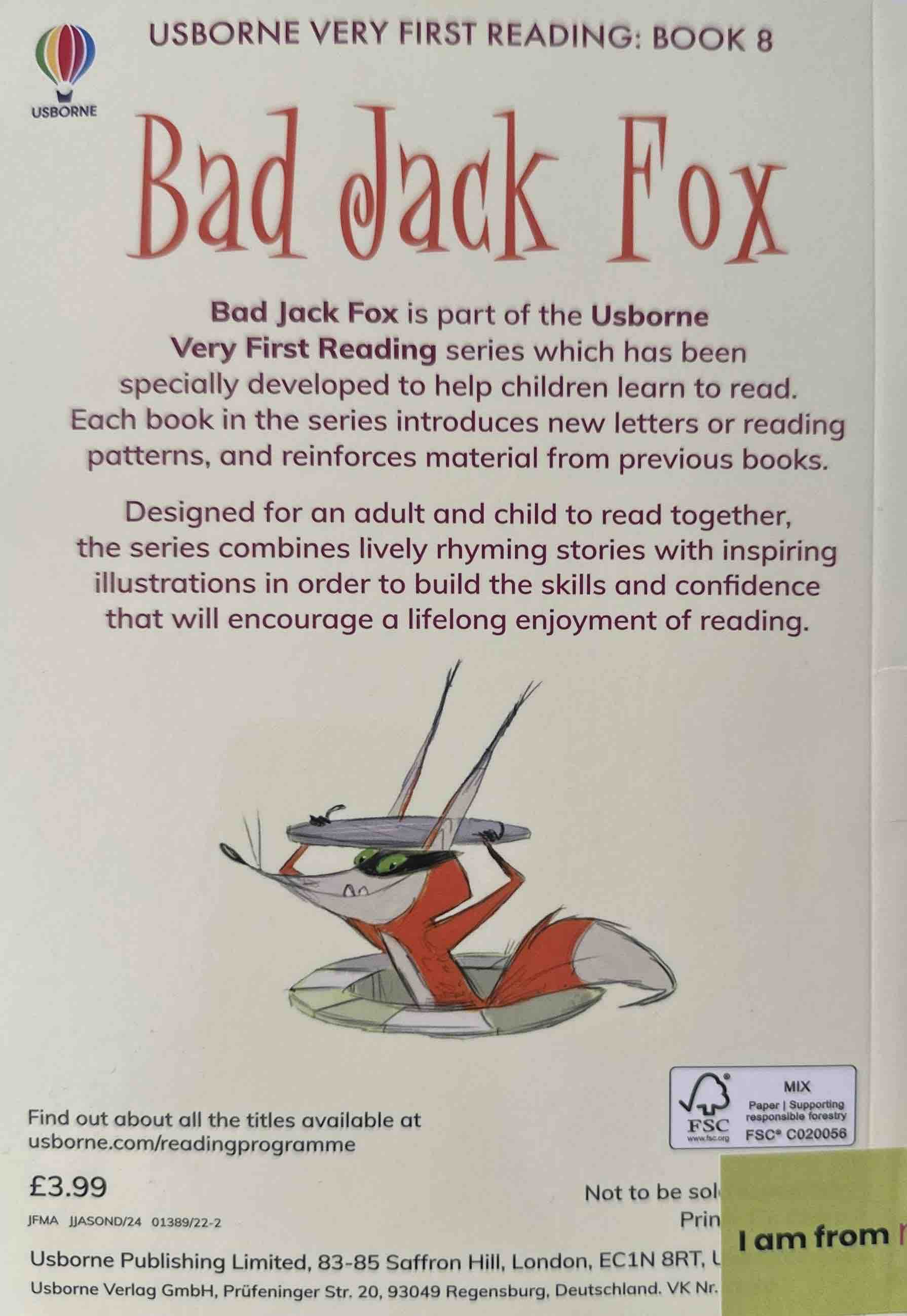 Bad Jack Fox is part of the Usborne Very First Reading series which has been specially developed to help children learn to read. Each book in the series introduces new letters or reading patterns, and reinforces material from previous books.