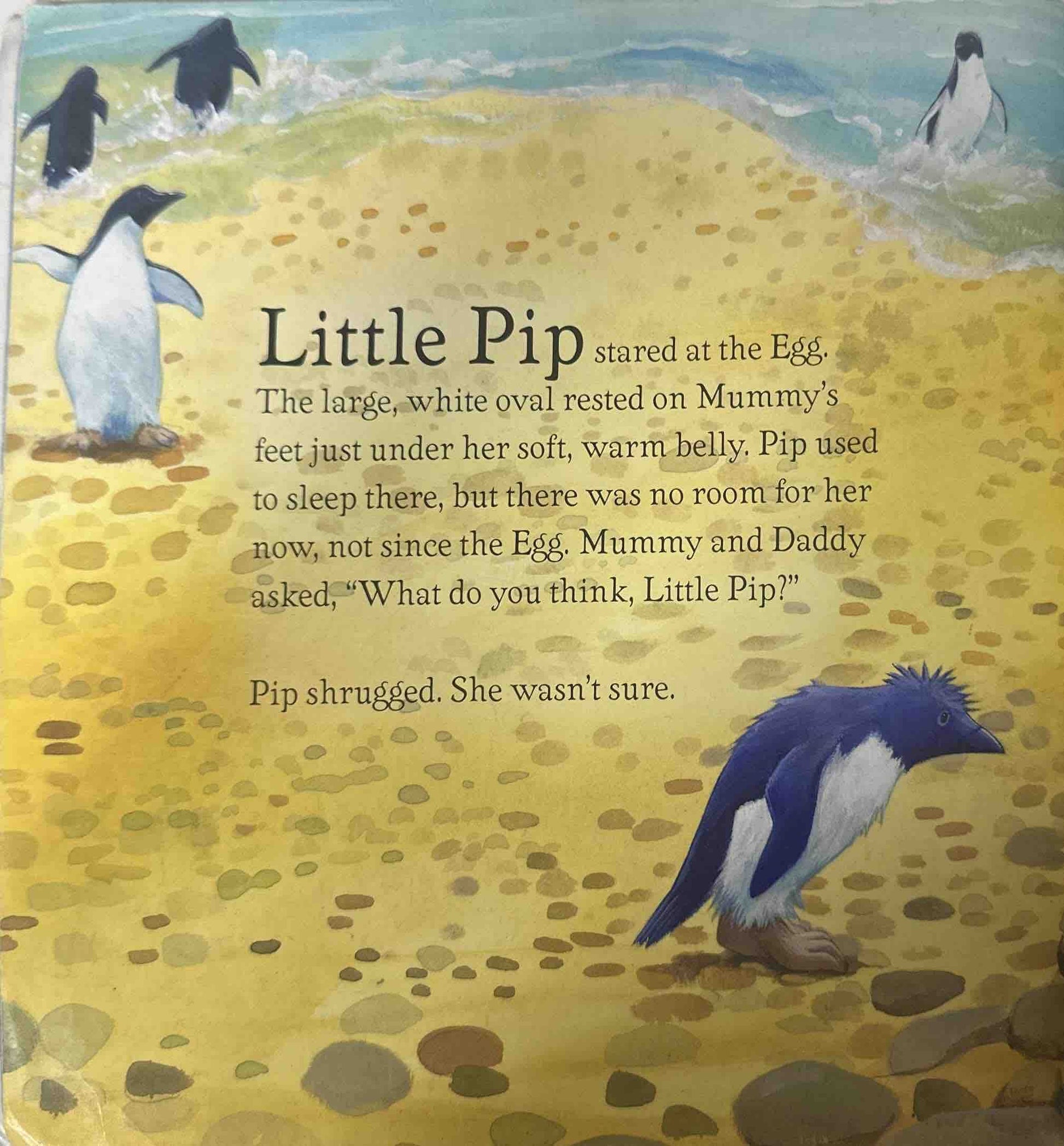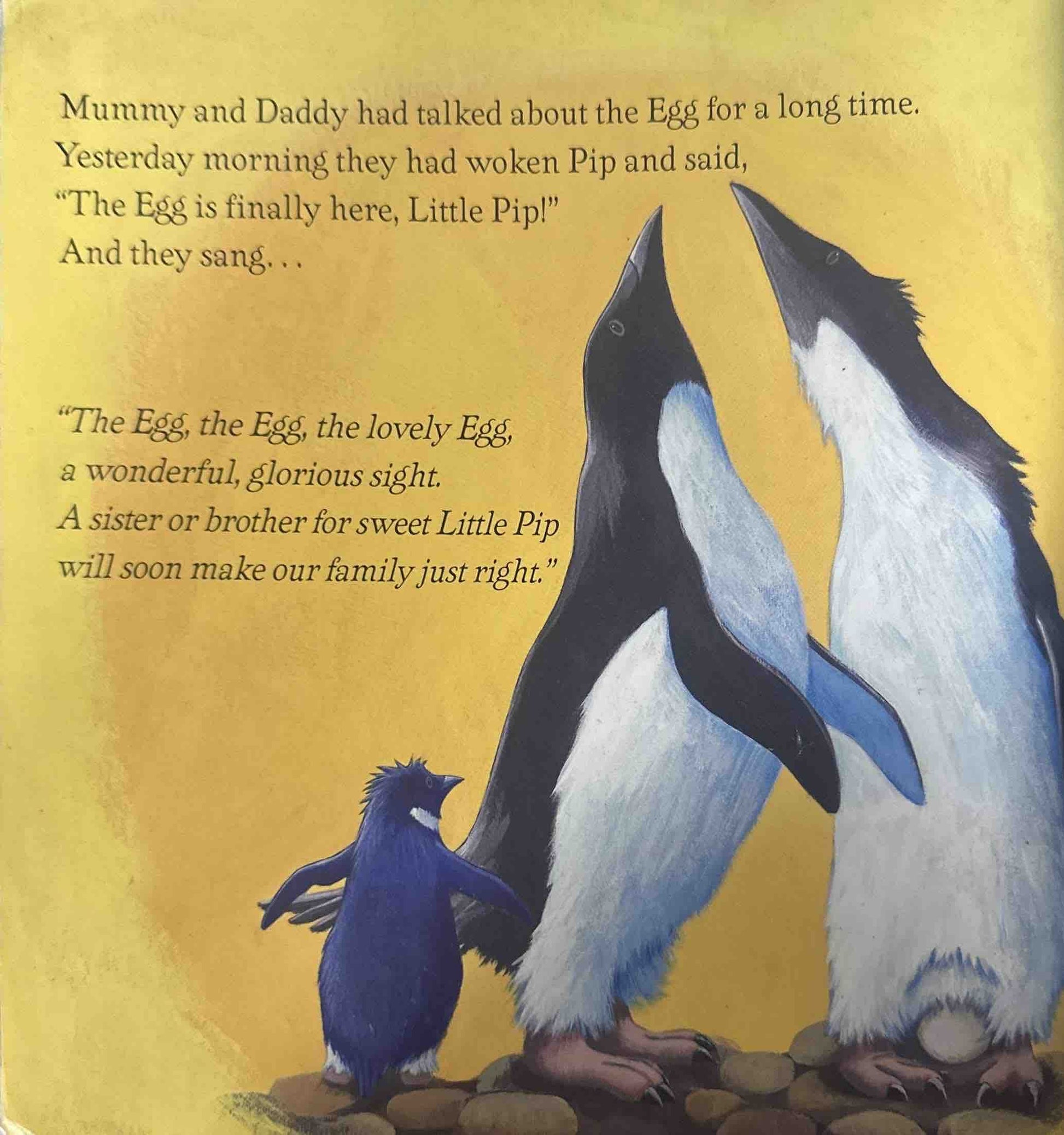 All through the long, harsh winter Pip's parents look after the egg, keeping it warm and safe. Little Pip learns to help as much as she can, even though she still doesn't know what all the fuss is about… until, one day the egg cracks open, and Little Pip meets her new baby brother for the first time!